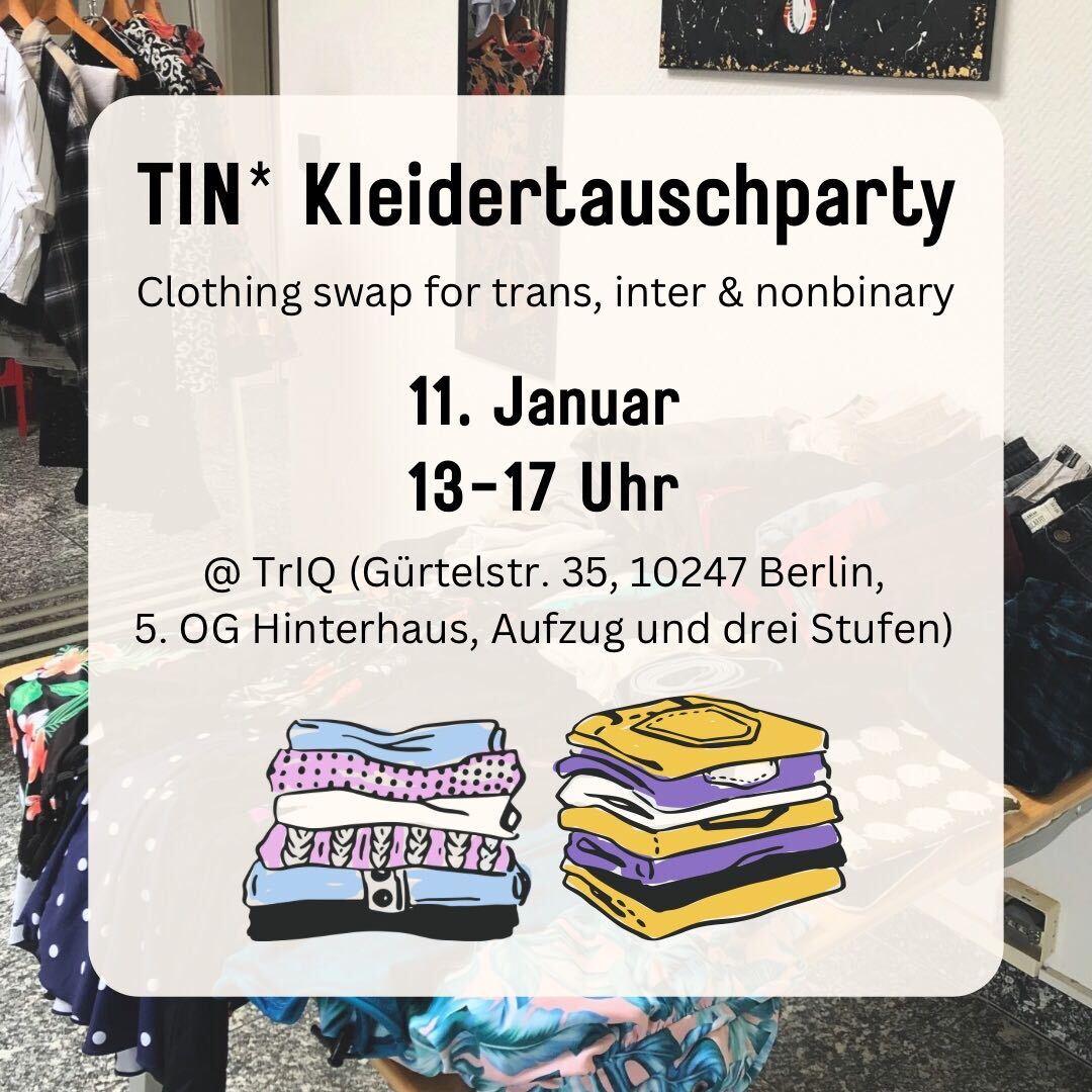 Then come to the next clothes swap party for trans, inter, and non-binary people on the 11th of January 2026 between 1 and 5 pm at Gürtelstraße 35. There will be recorded music, non-alcoholic drinks, and a potluck buffet.